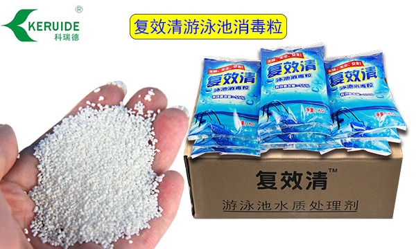 桃源居分有很多個區其中某一個區游泳館水質處理正使用科瑞德提供的游泳池消毒劑來維護水質哦,游泳館從開放直到現在池水消毒都只用復效清游泳池消毒劑,復效清是一種顆粒狀水處理劑,主要針對池水消毒殺菌防止水體發綠等作用。