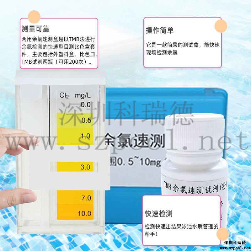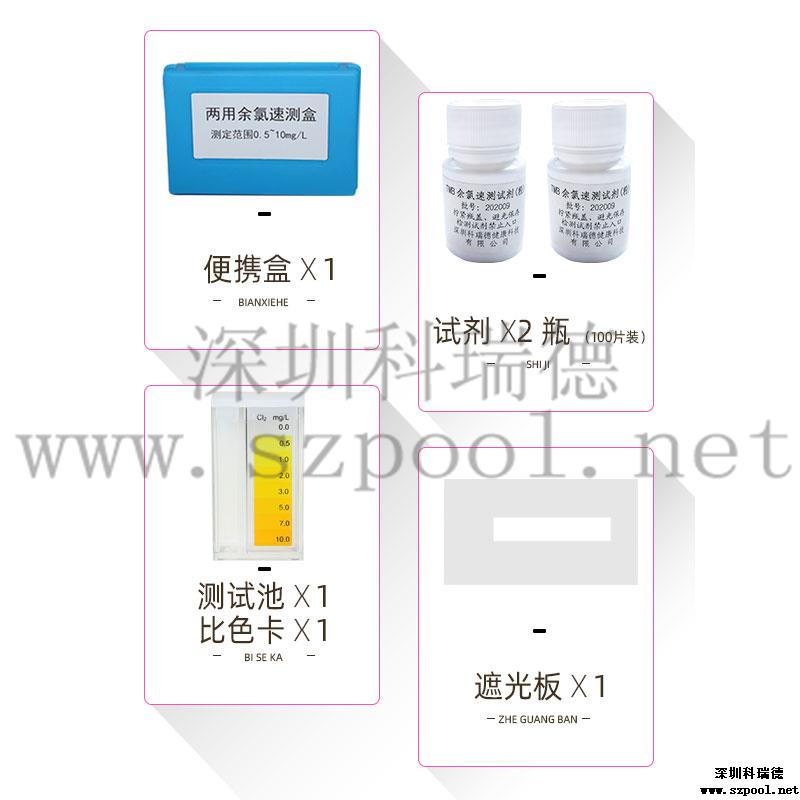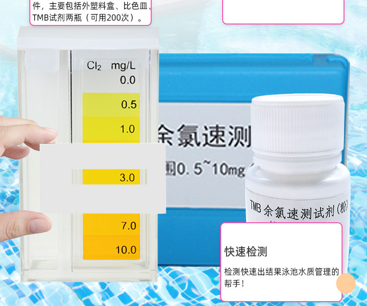 兩用余氯速測盒,是以TMB法進行余氯檢測的快速型目測比色盒套件,主要包括外塑料盒、比色皿、TMB試劑兩瓶(可用200次)。
