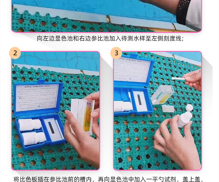 用比色皿在泳池水面下約20厘米處取水樣至刻度線;