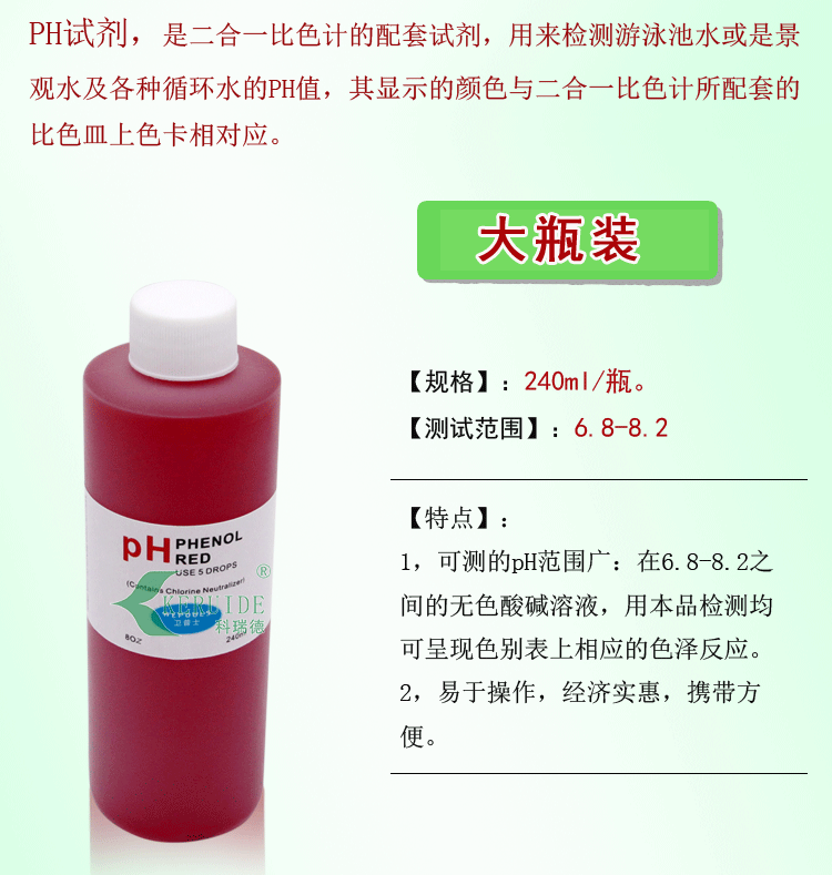 PH試劑,是二合一比色計的配套試劑,用來檢測游泳池水或是景觀水及各種循環水的PH值,其顯示的顏色與二合一比色計所配套的比色皿上色卡相對應。