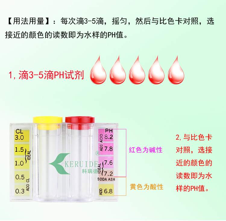 每次滴5滴,搖勻,即可與色卡對照,選接近的顏色的讀數即為水樣的PH值。