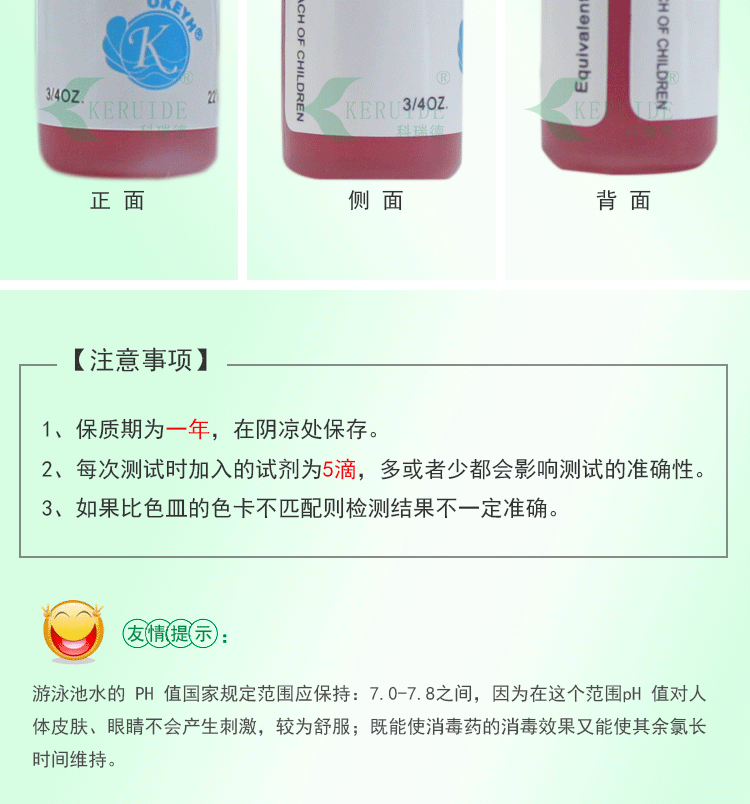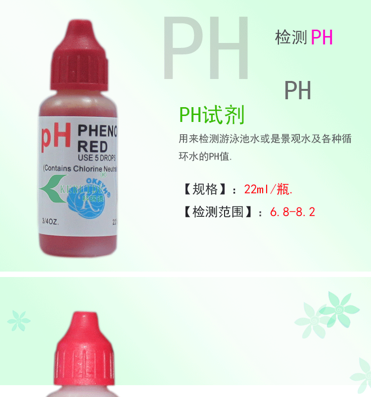 PH試劑,液體試劑,也叫PH試液,是二合一比色計的配套試劑,用來檢測游泳池水或是景觀水及各種循環水的PH值,其顯示的顏色與二合一比色計所配套的比色皿上色卡相對應。