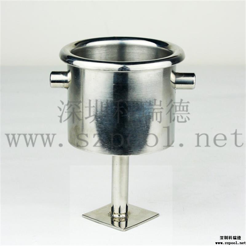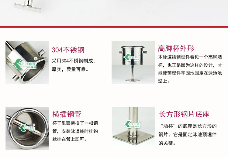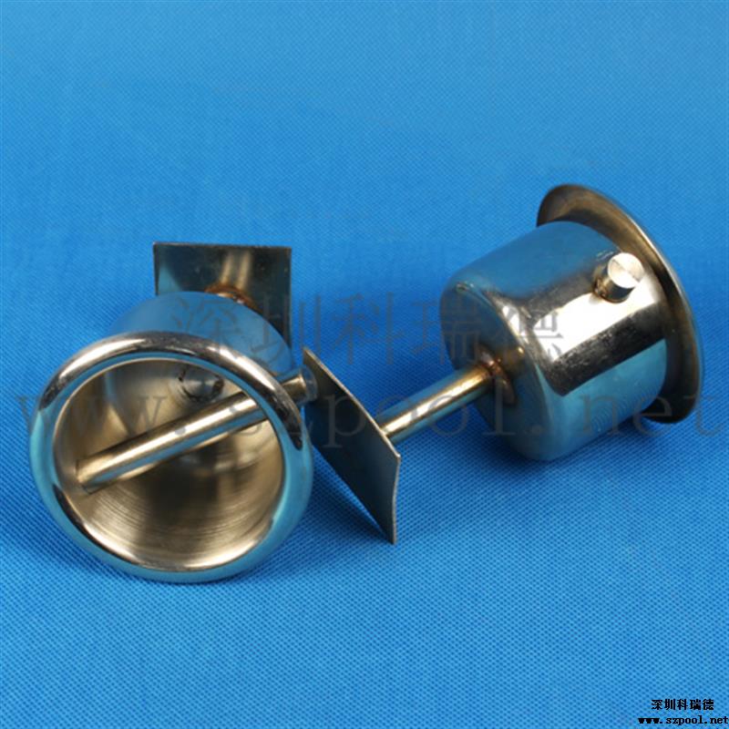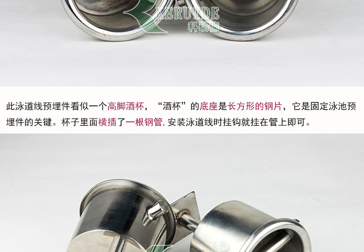 本泳道線預埋件看似一個高腳酒杯,也正是因為這樣的設計,才能使預埋件在泳池建造之初牢固地固定在泳池池壁上?!熬票钡牡鬃情L方形的鋼片,它是固定泳池預埋件的關鍵。杯子里面橫插了一根鋼管,安裝泳道線時掛鉤就掛在鋼管上即可。