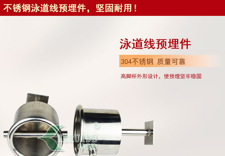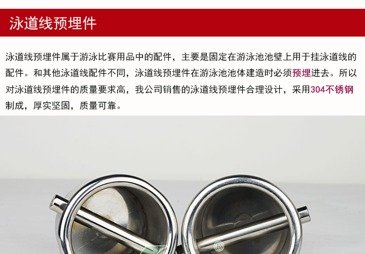 泳道線預埋件:屬于游泳比賽用品中的泳道配件,固定在游泳池池壁上用于掛泳道線的不銹鋼配件。和其他泳道線配件不同,泳道線預埋件在游泳池池體建造時必須預埋進去。所以對泳道線預埋件的質量要求高,我公司銷售的泳道線預埋件合理設計,采用304不銹鋼制成,厚實,質量可靠。
