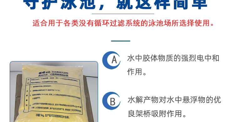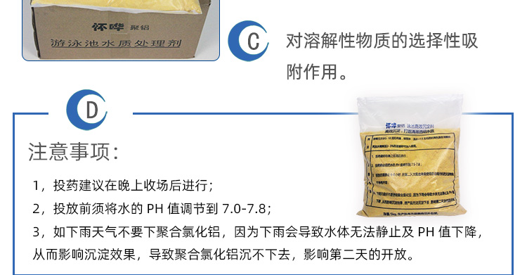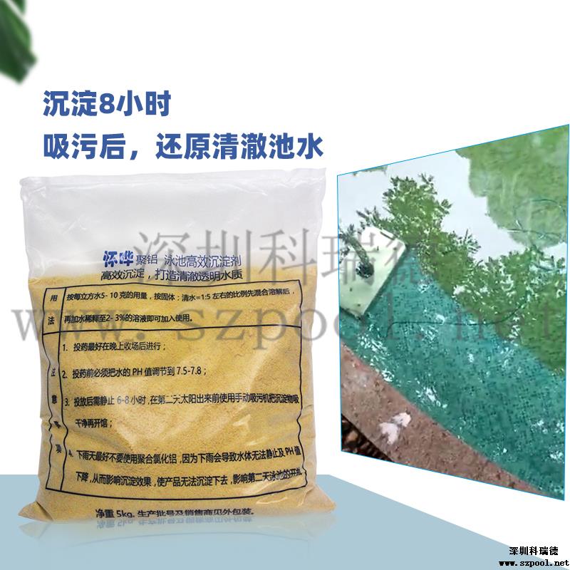 【注意事項】:投放游泳池沉淀劑建議在晚上收場后進行。投放前必須將水的 PH 值調節到 7.0-7.8,如下雨天氣不要下沉淀劑,因為下雨會導致水體無法靜止及 PH 值下降,從而影響沉淀效果,導致聚合氯化鋁沉不下去,影響第二天的開放。