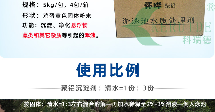 【使用方法】:按每1000立方水5-10KG的用量.使用時按游泳池沉淀劑(聚合氯化鋁)1份:清水3份的比例先混合溶解后,再加水稀釋到2-3%的溶液即可灑入泳池中使用。
