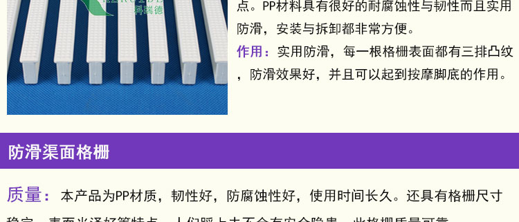 游泳池格柵又叫防滑渠面格柵、防滑篦子等,本游泳池格柵表面設計的凹凸紋,密度以及紋路合理的。防滑的同時,人光腳踩上去也舒服。