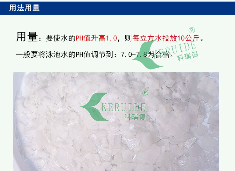 用法與用量:游泳池一般使用PH調節劑來提高泳池水的pH 值,每升高1.0按每立方水10克的劑量投放。也就是說1000 立方要使PH提高1.0則需要加入10公斤的PH調節劑。 使用前,先把pH調節劑倒進桶中進行溶解,然后再沿著池壁把溶解好的試劑均勻倒進池中(注意不要在局部位置大面積倒入試劑,否則該位置的總堿度會被一下子大大提高從而引起水質渾濁)。