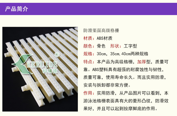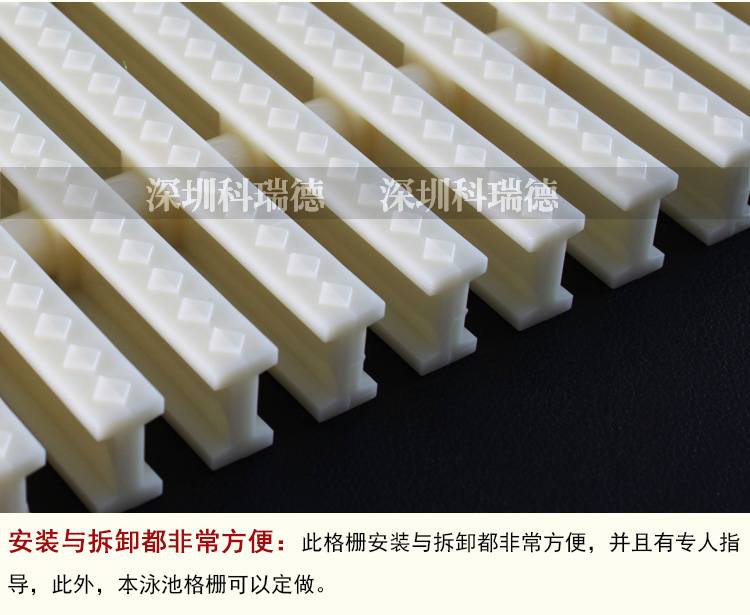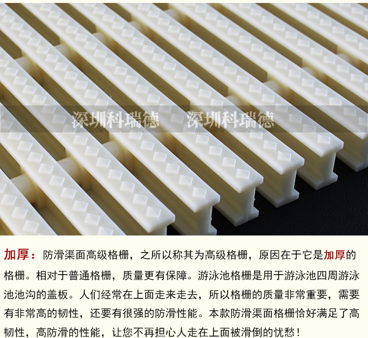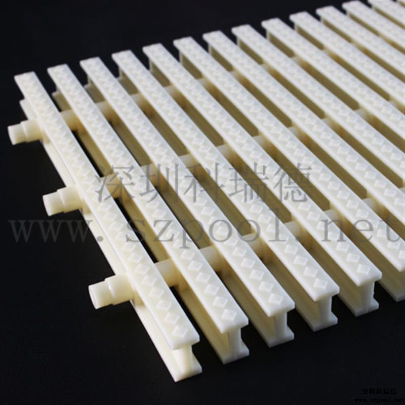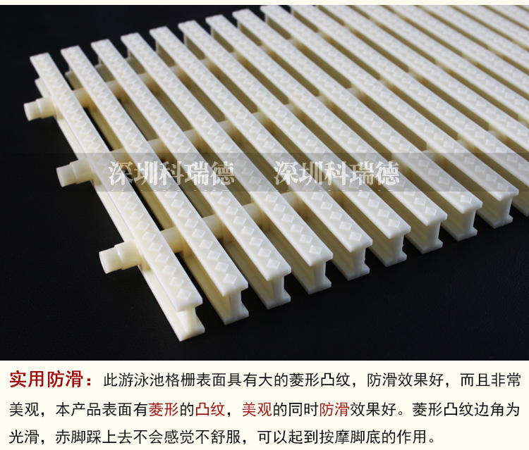 防滑渠面高級格柵:與普通的格柵相比,它采用高級ABS塑料制造,并且是加厚型的,質量非常好。防滑渠面高級格柵是游泳池格柵的一種,同屬于游泳池工程配件。游泳池格柵是作為游泳池四周排水溝的塑料蓋板,在可以方便人們行走的情況下又起到排水的功能,本泳池格柵還可以起到按摩腳底的作用。是泳池管理者的合理選擇。也叫防滑格柵,防滑渠面格柵,游泳池排水溝格柵,游泳池防滑格柵,塑料格柵,ABS格柵。