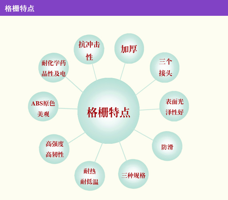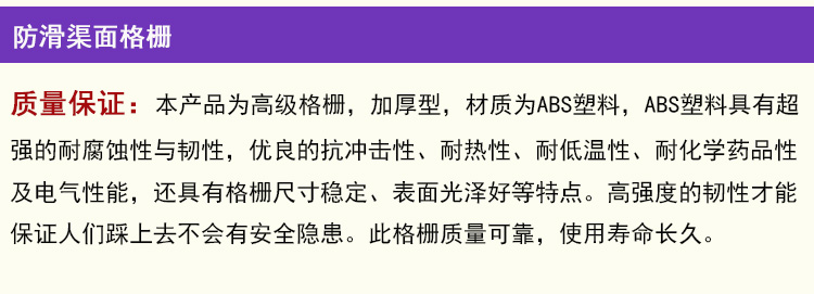 材料:ABS塑料,本產品由ABS材質特殊加工制成,ABS是一種強度高、韌性好、抗老化的熱塑型高分子材料,使得本產品具有韌性強,抗老化,耐腐蝕等特點。ABS塑料是游泳池格柵理想的材料。