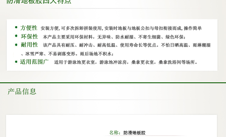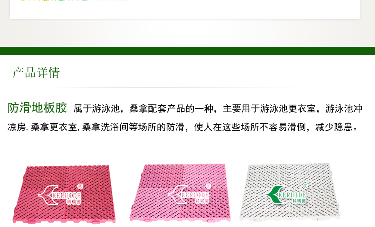 防滑地板膠屬于游泳池,桑拿配套產品的一種,主要用于游泳池更衣室,游泳池沖涼房,桑拿更衣室,桑拿洗浴間等場所的防滑,使人在這些場所不容易滑倒,保證安全.防滑地板膠也叫防滑地墊,更衣室防滑墊子,游泳池防滑地板膠,浴室防滑墊。