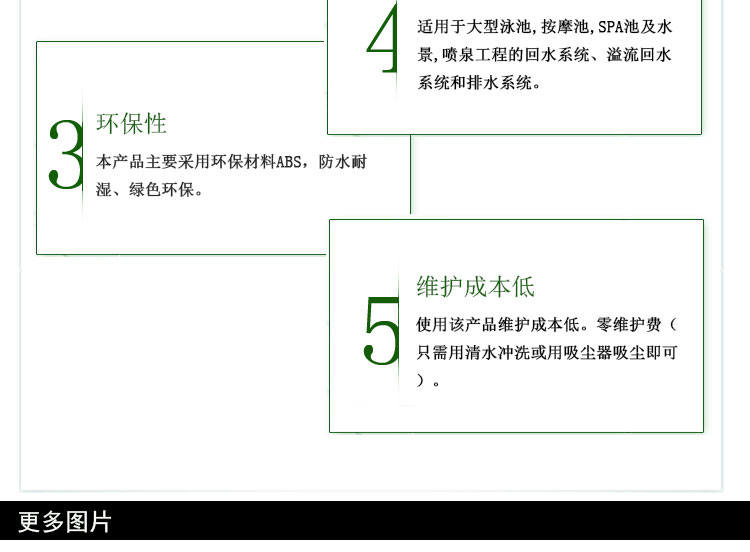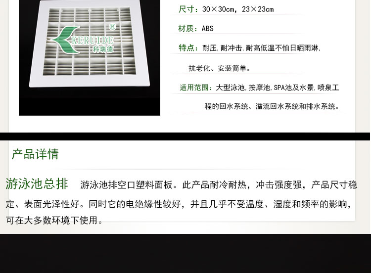 泳池總排:是用于游泳池排水口的面板,一般安裝在池底或池壁,用于排水的。也在叫做回水口。