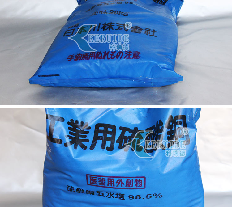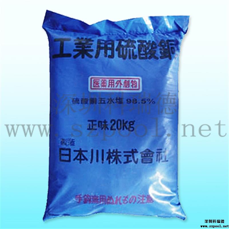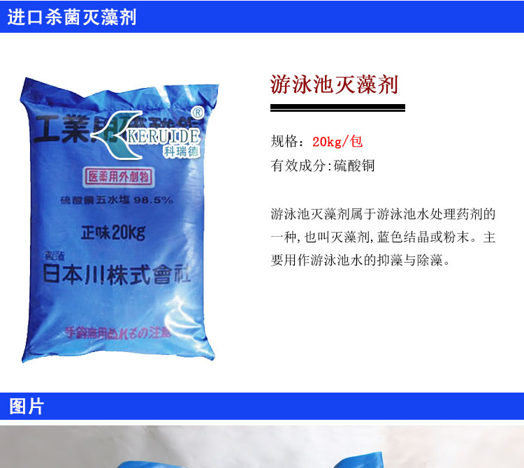 硫酸銅滅藻劑屬于游泳池水處理藥劑的一種,也叫硫酸銅殺藻劑,化學式為CuSO4·5H2O,為藍色不對稱三斜晶系結晶或粉末。主要用作游泳池水的抑藻與殺藻。本款殺藻劑主要成分為硫酸銅,有殺藻抑藻的作用。
