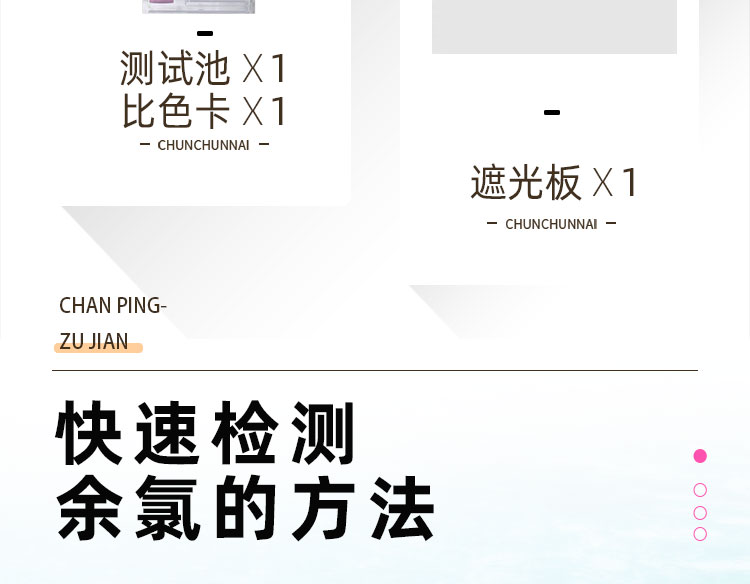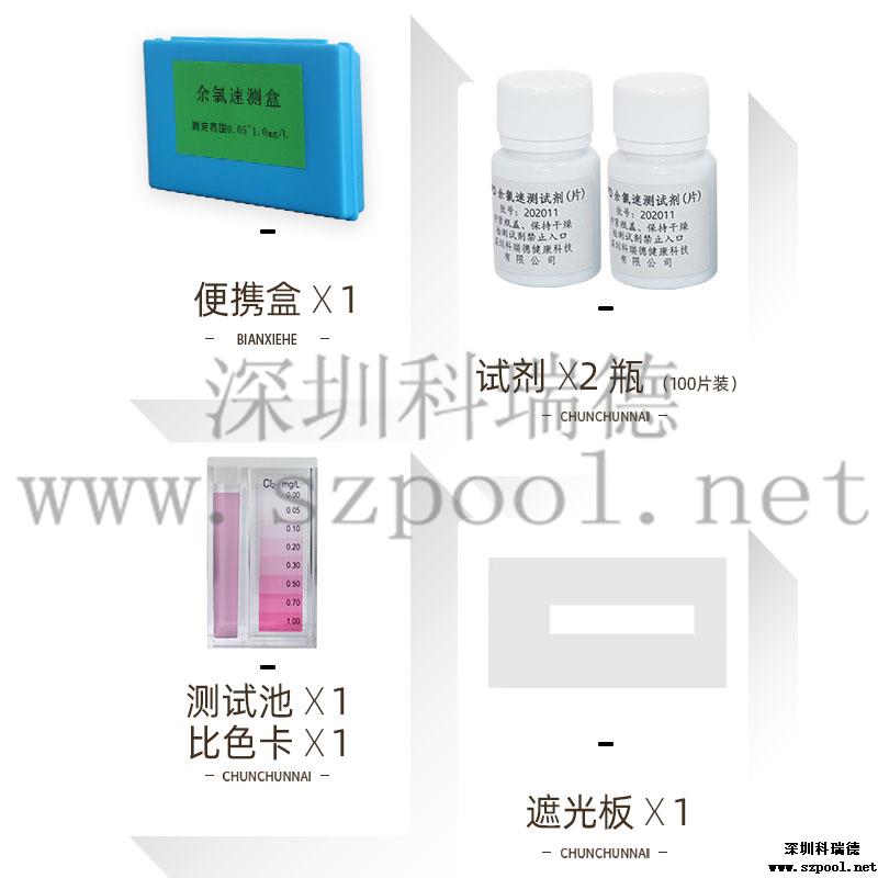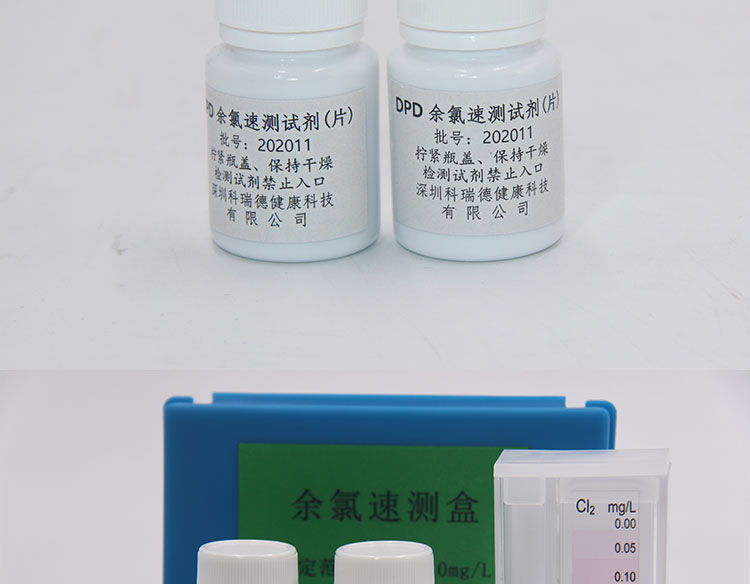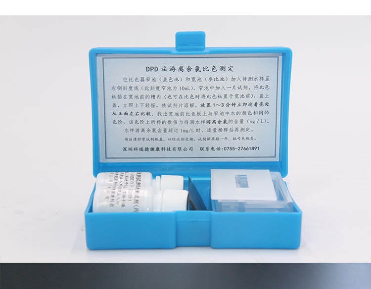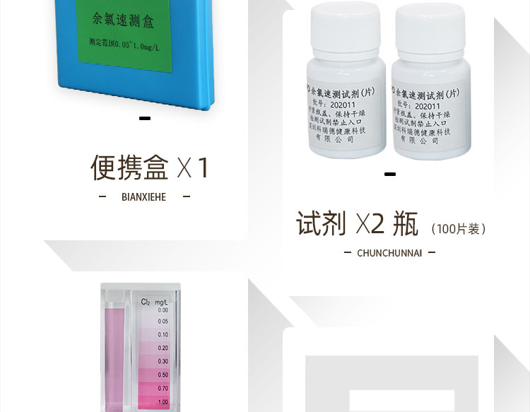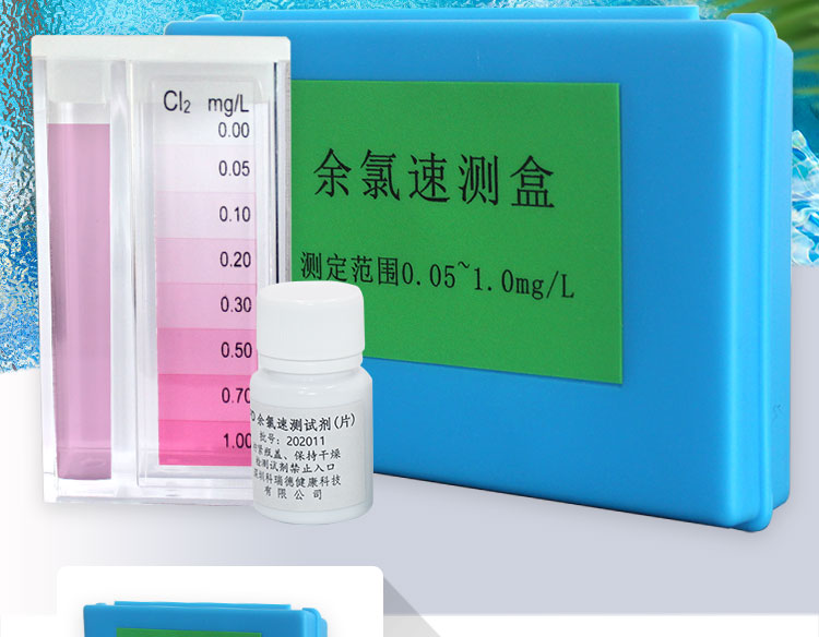 余氯速測盒:是以DPD法進行余氯檢測的快速型目測比色盒套件,主要包括外塑料盒、比色皿、DPD試劑兩瓶(200片)。能快速且可靠地現場檢測余氯。