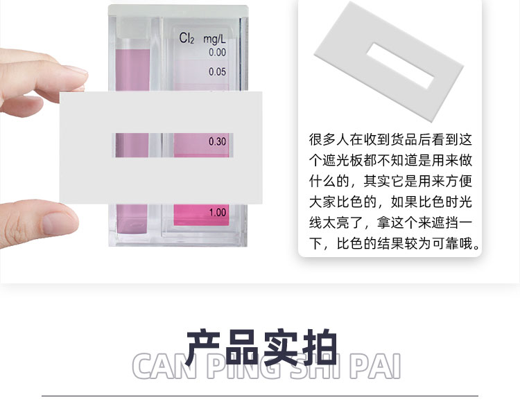 3,將水樣的顏色與色卡的顏色對比,選接近的讀數就是水樣的余氯濃度,單位是mg/L。