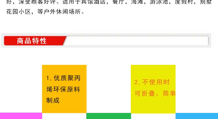 產品特點表面光滑、安全舒適、質量好、耐老化、美觀大方、價格合理、結構堅固,抗日曬雨淋,不易褪色。光澤度好,深受顧客好評。