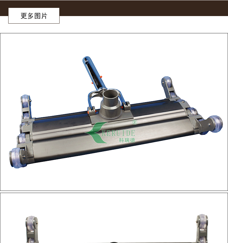 本吸污頭為19寸鋁合金吸污頭,鋁合金手柄,兩頭各6個,轉動方便靈活,可以清洗泳池池底。底部有刷毛,可以邊洗邊刷,而且鋁合金材質厚重,不上浮,吸污干凈。
