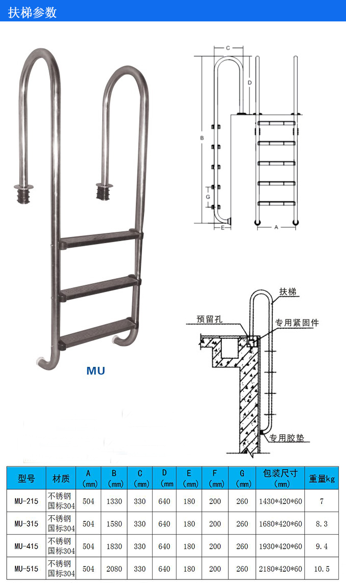 本扶梯有:2級,3級,4級和5級,客戶可以根據自己泳池的情況選擇定制。更多咨詢客服!