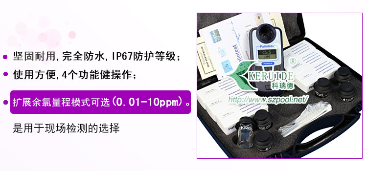 可檢測總硬度,溴,余氯(游離余氯和總余氯),PH,鈣硬度和氰尿酸;