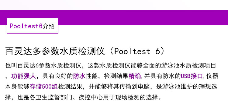 百靈達六參數水質檢測儀(Pooltest 6),也叫百靈達6參數水質檢測儀,直讀式光度計,可以檢測6個不同的參數,總堿度、溴、余氯(游離余氯和總余氯)、pH、鈣硬度和氰尿酸等,快速簡單、數據可靠,使用方便的特點,是游泳池水質維護的選擇。