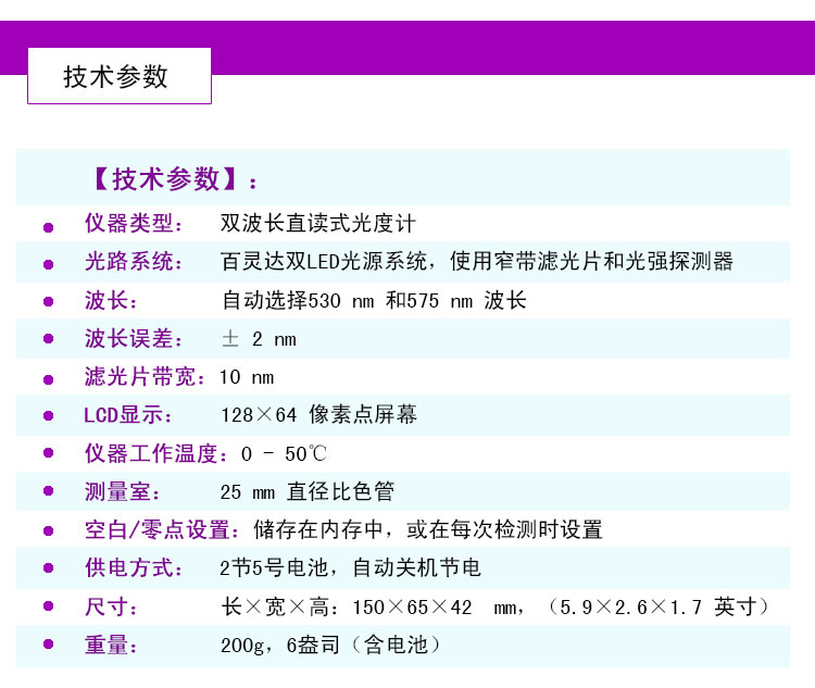 | 儀器類型 | 雙波長直讀式光度計 |