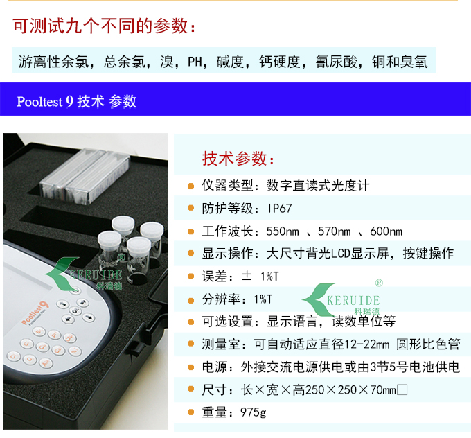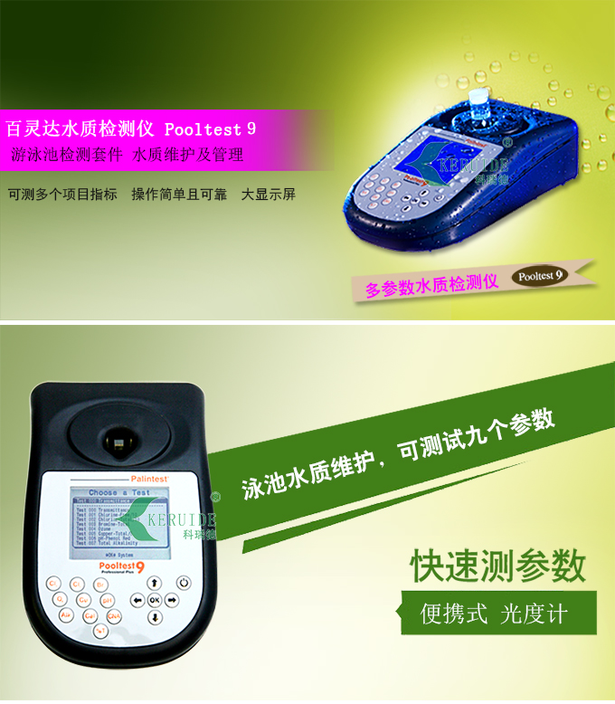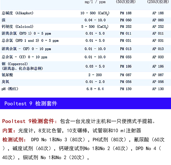 不過百靈達 Pooltest9主要用于泳池水質維護,可測試九個參數:游離氯,總余氯,溴,PH,堿度,鈣硬度,氰尿酸,銅和臭氧。