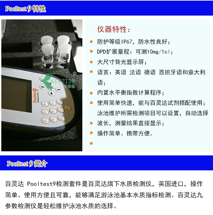 百靈達九參數水質檢測儀(Pooltest 9),也叫百靈達多參數水質檢測儀,這款水質檢測儀能夠檢測游泳池水質多項目,具有良好的防水性,檢測結果快速簡單,并具有防水的USB接口,儀器本身能夠存儲500組檢測結果,并能夠將其傳輸到電腦,是游泳池水質維護及管理的理想選擇。