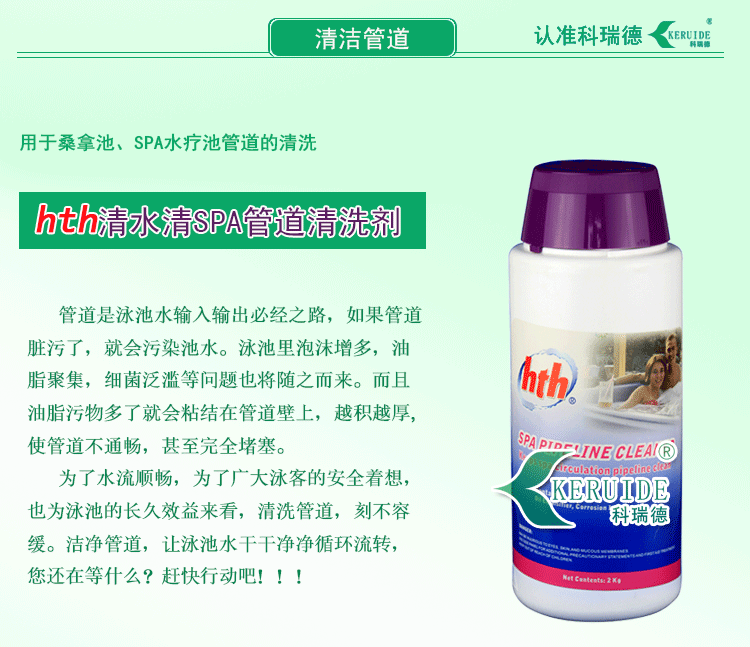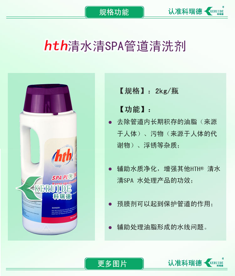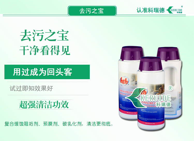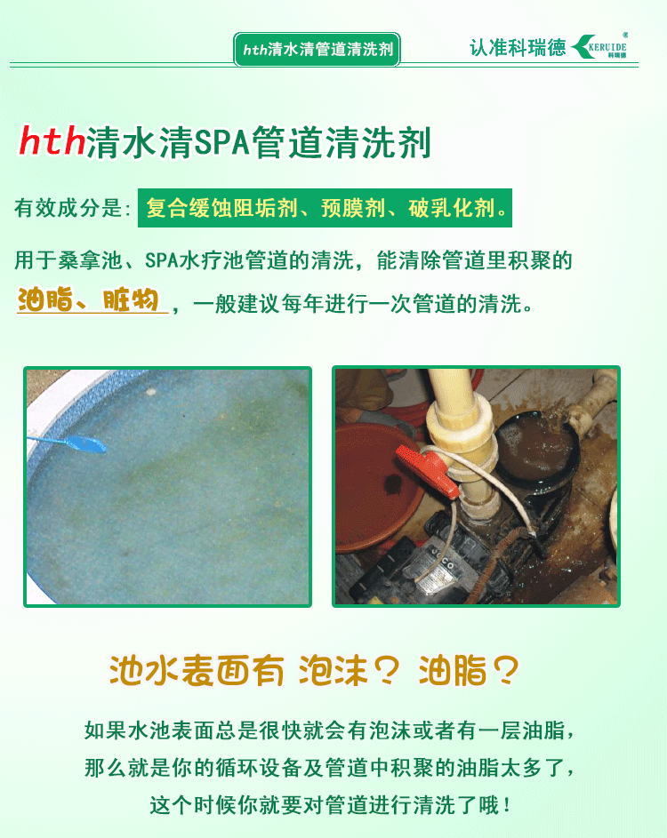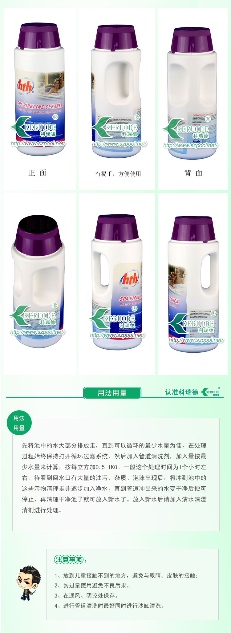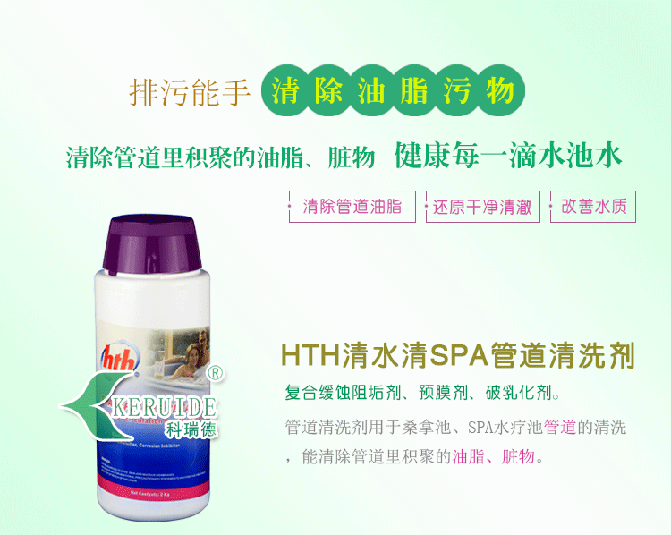 【功能】:管道清洗劑用于去除管道內長期積存的油脂(來源于人體)、污物(來源于人體的代謝物)、浮銹等雜質; 輔助水質凈化,增強其他HTH? 清水清SPA 水處理產品的功效; 預膜劑可以起到保護管道的作用; 輔助處理油脂形成的水線問題。