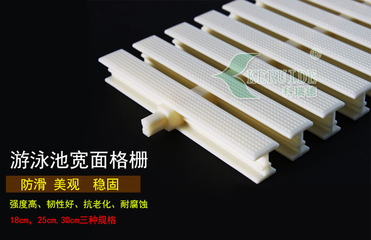 工字型游泳池格柵的特點為寬面格柵,單挑面寬就有24mm,游泳格柵是作為排水溝上面的塑料蓋板,游泳池格柵又叫:游泳池排水溝格柵,防滑渠面格柵,游泳池溢水格柵,簡稱格柵。