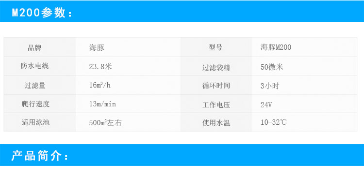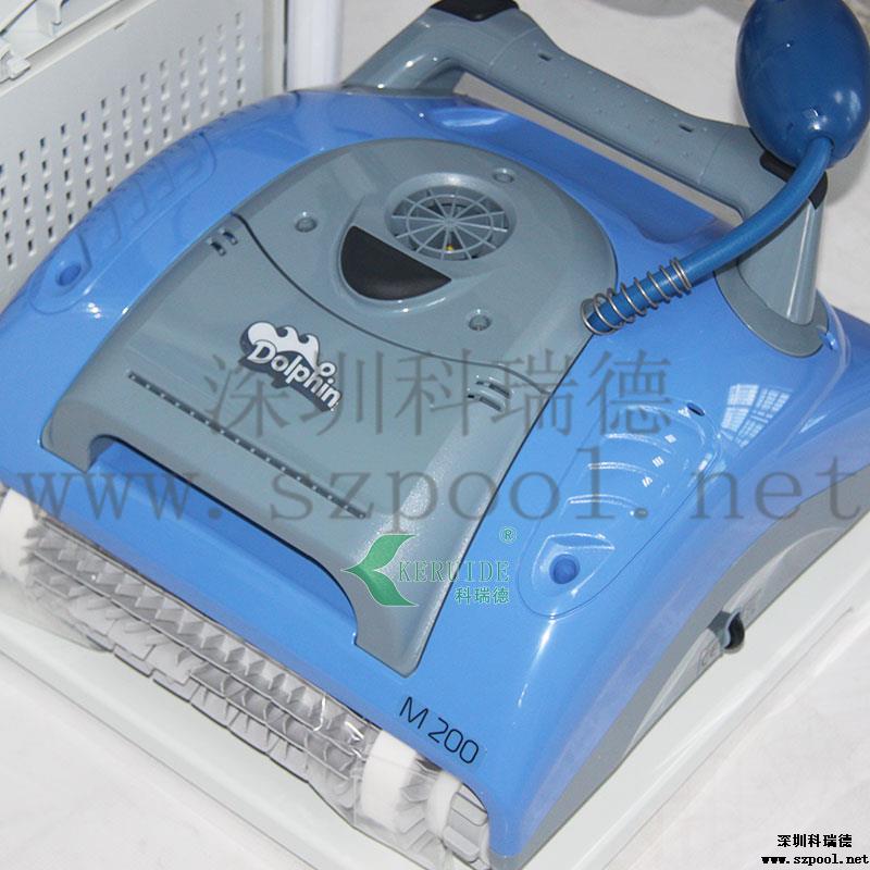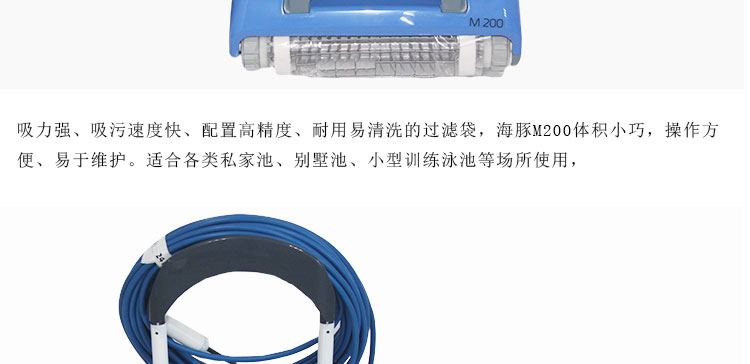 海豚吸污機M200型也叫游泳池全自動吸污機,時尚新穎、小巧便攜,是家庭、小型游泳池的選擇,主要用于私家泳池的池底吸污。
