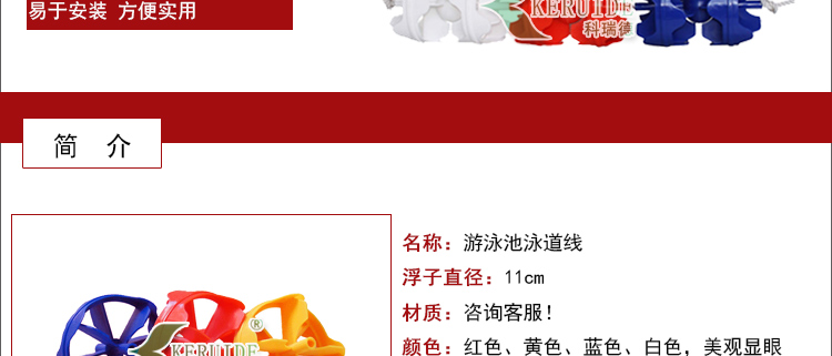 本款泳道線設計新穎:從產品圖片可以看出它是由小珠子將兩個浮子合起來,消波阻浪。做工精良:質量層層把關。色澤鮮艷:紅藍黃三種明亮的顏色,耐蝕耐用:抗老化,使用時間長。消波壓浪:自浮力強,易于安裝。