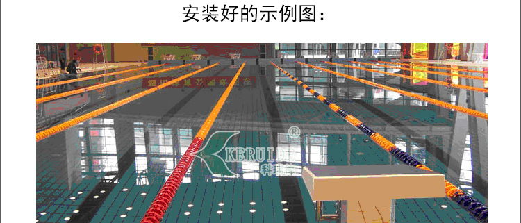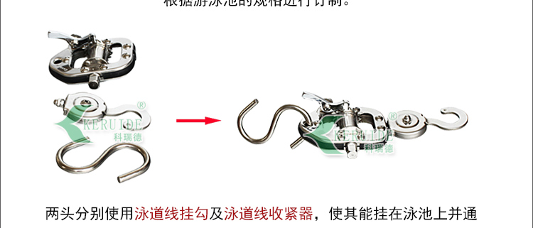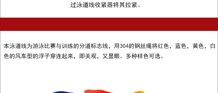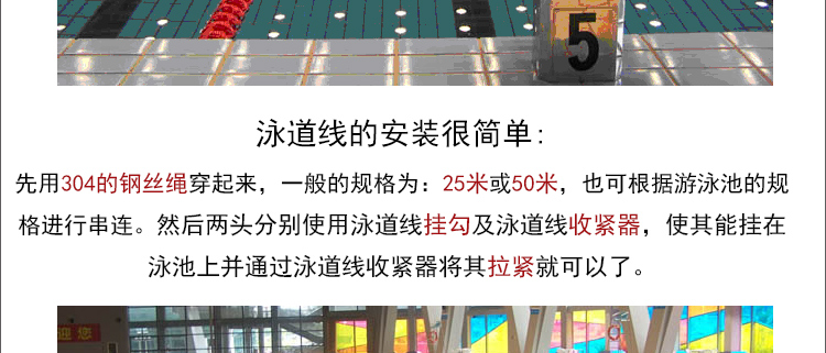 采用304的鋼絲繩穿起來,一般的規格為:25米或50米,也可根據游泳池的規格進行訂制。兩頭分別使用泳道線掛勾及泳道線收緊器,使其能掛在泳池上并通過泳道線收緊器將其拉緊。