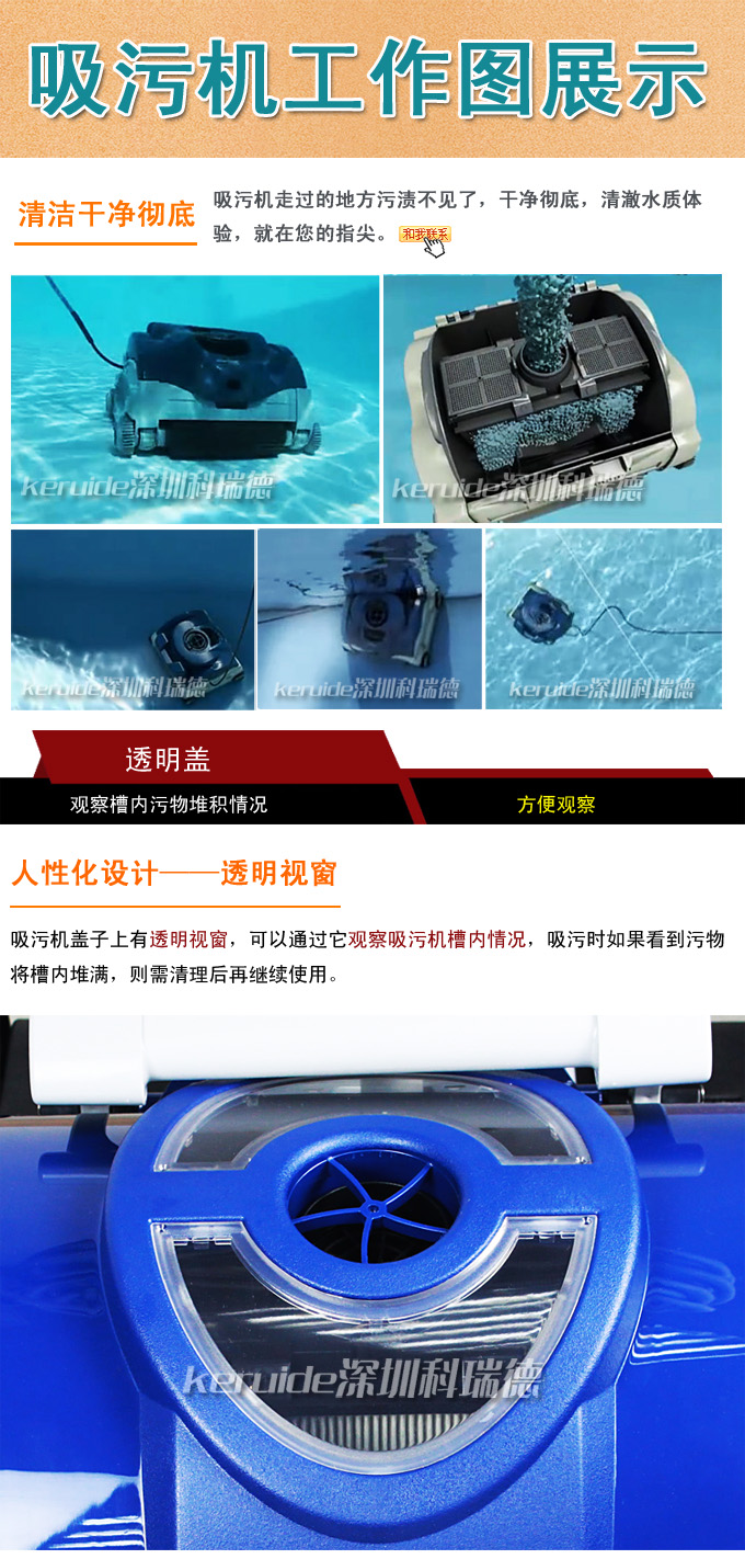 【優點】:彩鯊吸污機的過濾精度高達5微米,是所有吸污機中過濾效果較好的,能有效吸走池底各類臟東西,并且能起到過濾水中懸浮的細小灰塵。清洗方便,有透明窗可以看到機器里的臟物是否需要清洗。