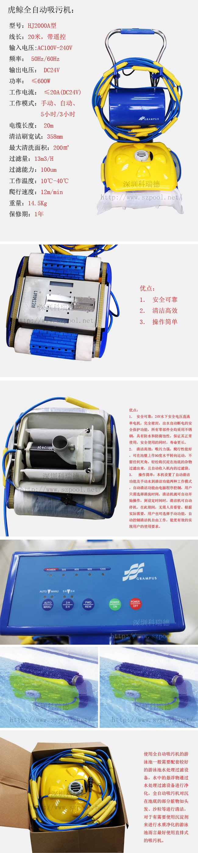 2. 清潔高效:吸污力強,爬行性能好,可在池壁上作90度水平轉向運動,不留任何死角。輕松將沉淀在池底的雜物過濾出來,且自動收入機內的過濾袋。