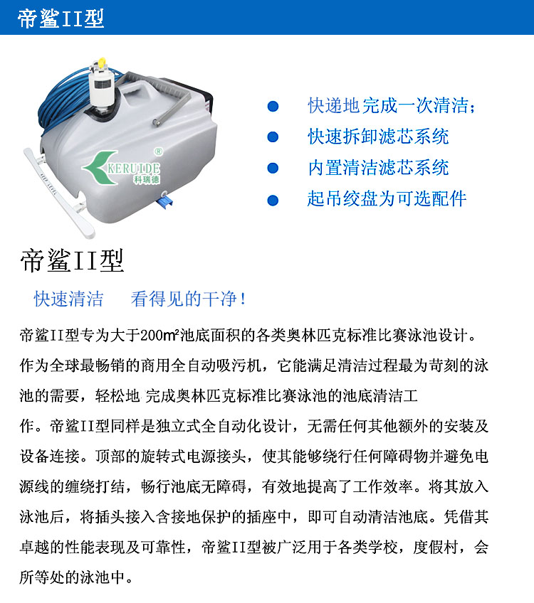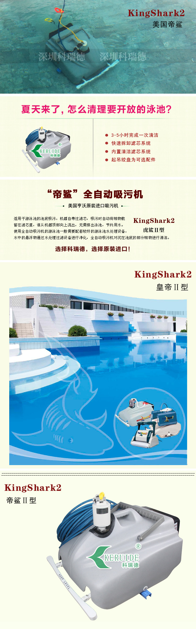 優點:鯊魚系列皇帝型吸污機,又稱帝鯊2型游泳池清洗器,不爬墻,是美國亨沃公司制造的。帝鯊吸污機能清洗標準要求高的游泳池,它是全自動吸污機,游泳池工作者不需要做任何操作,直接把它放入泳池,看著就行,使復雜的清洗工作變得簡單。帝鯊全自動吸污機是一種完全自動的自成一體的獨立設備,自身擁有過濾紙芯,游泳池雜物通過過濾紙芯過濾收集,不需接上軟管或任何特殊過濾器件。吸污快速且高效,它可以在5小時內清洗完一個運規格的標準泳池。當吸污完成后,我們把它的過濾紙芯拆卸下來,易清洗。帝鯊吸污機堅固耐用,它能夠承擔很繁重的作業。所以帝鯊全自動吸污機是一款可靠、實用的吸污機,值得買家信賴。