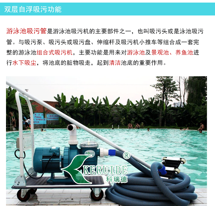 游泳池吸污管是手動吸污機的主要部件之一,也叫吸池喉。與吸污泵、吸污頭、伸縮桿及吸污機小推車等組合成一套完整的游泳池組合式吸污機,主要功能是用來對游泳池及景觀池、養魚池進行水下吸塵,將池底的臟物吸走,起到清潔池底的重要作用。