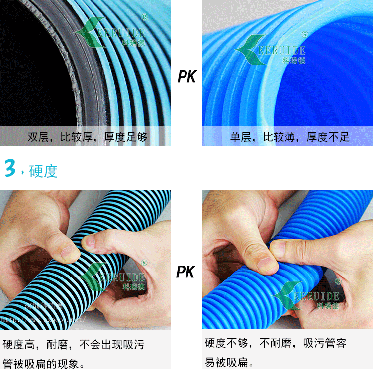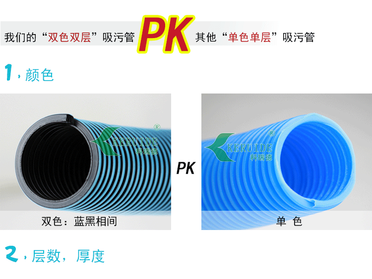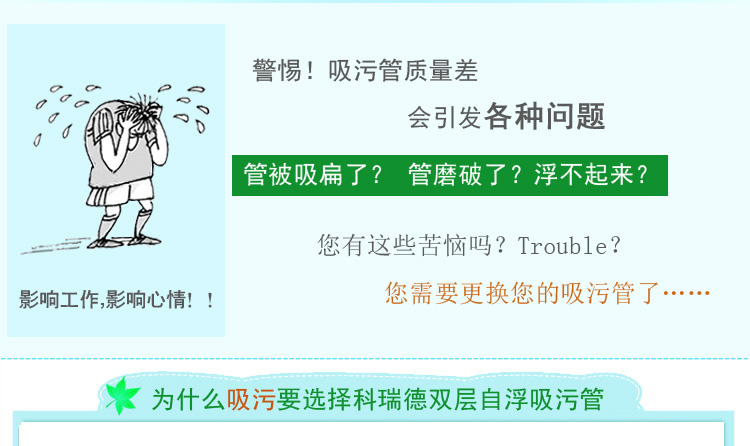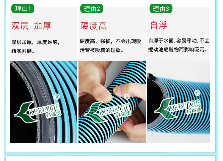 【優點】:雙層管,夠硬度,不會被吸扁;能自浮于水面容易移動,并且不會攪動池底的臟物而影響吸污效果。