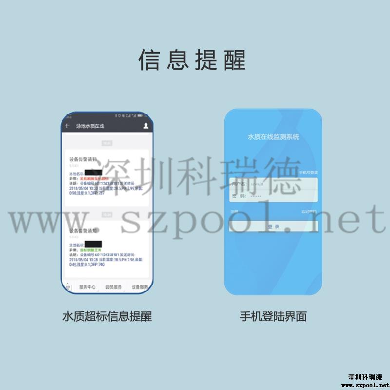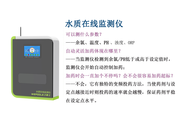 智能化全自動水質監控系統:游泳池余氯PH在線監測儀,也叫泳池余氯PH在線檢測儀,實時在線監控泳池水的余氯和PH、溫度,自動控制加藥,讓余氯PH時刻保持在設定值,簡單方便,節省消毒藥和減少人工,保證泳池水質穩定達標。