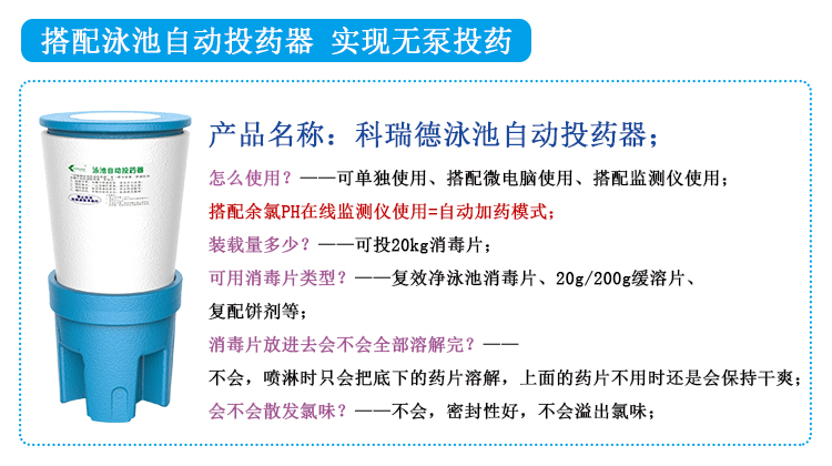 科瑞德?泳池自動投藥器也叫泳池自動加藥桶,適用于任何泳池,用于投加固體緩溶消毒片。它采用固液分離、即用即溶、桶內負壓、水隔式密封等技術手段,適合自動投加固體緩溶消毒片,并且在投放過程中不會有氯味溢出,加藥不 會感到不適。另外它還有一個特點:裝載量大,一次性可裝20kg的緩溶消毒片。