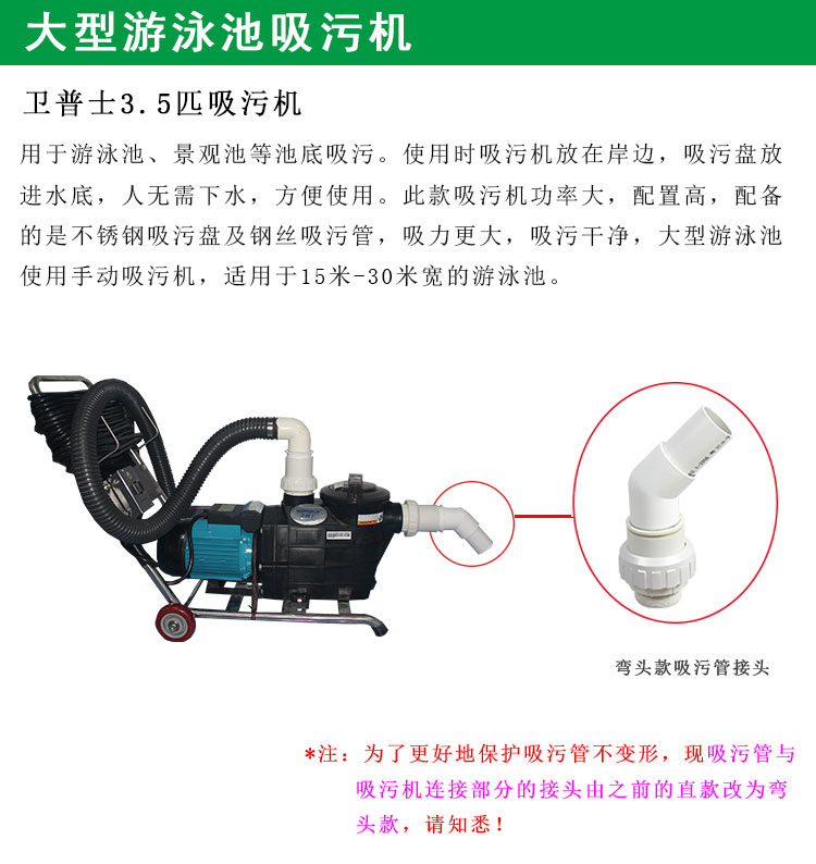 衛普士游泳池吸污機手動(組合式,岸基型),功率為3.5匹,是游泳池手動吸污機中功率較大的,也叫大型泳池吸污機或標準池吸污機,景觀池吸污機。