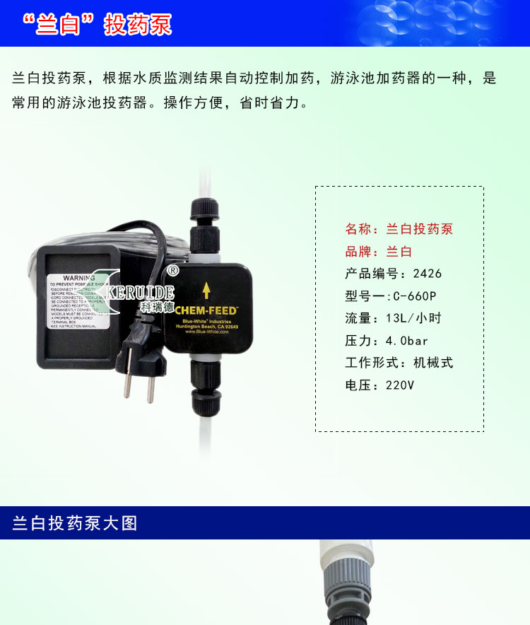 “藍白”投藥泵,與C-6125P投藥泵屬同一系列,外觀相同,規格不同。藍白投藥泵根據水質監測結果自動控制加藥,游泳池加藥器的一種,是常用的游泳池投藥器。節省人工和勞力,而且操作方便,節省時間。