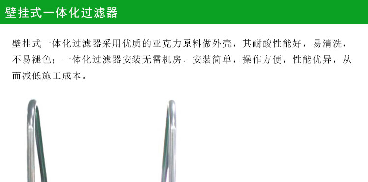 游泳池壁掛式一體化過濾器采用優質的亞克力原料做外殼,其耐酸性能好,易清洗,不易褪色;一體化過濾器安裝無需機房,安裝簡單,操作方便,性能優異,從而減低施工成本。
