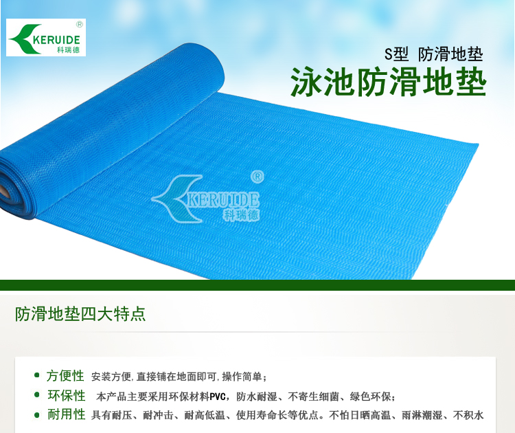 PVC防滑地墊,屬于游泳池,桑拿配套產品的一種,主要用于游泳池岸邊,更衣室,沖涼房,更衣室,洗浴間等場所的防滑,使人在這些場所不容易滑倒,安全。