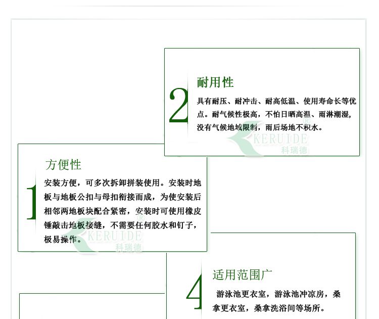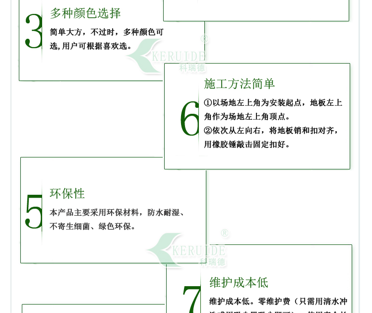2,環保性:本產品采用環保材料,無毒無味、防水耐濕、不寄生細菌、綠色環保;