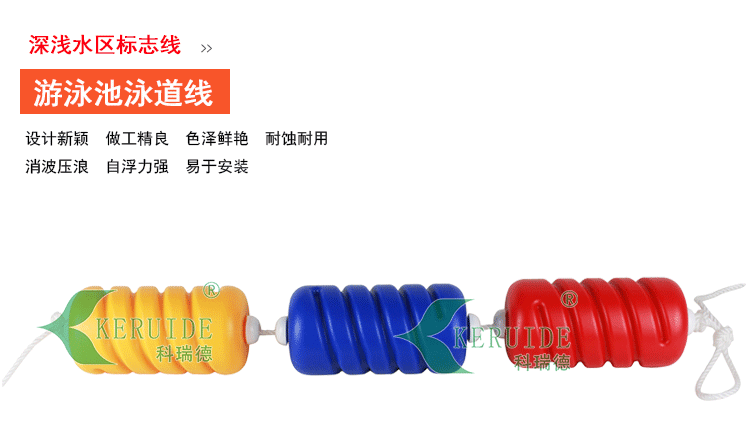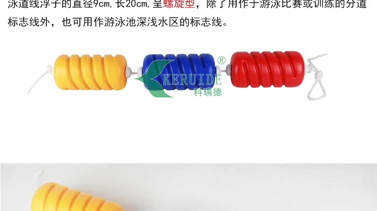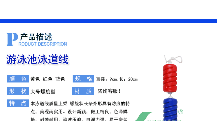 形狀:泳道線浮子呈大號螺旋型,螺旋狀長條外形具有防浪阻浪的作用。