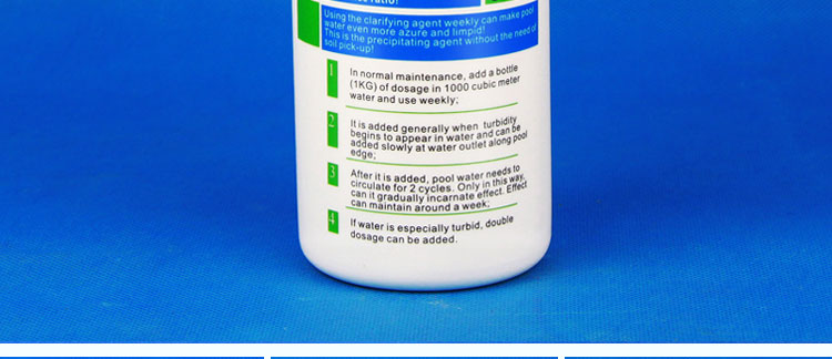 3,After it is added,pool water needs to circulate for 2 cycles.Only in this way,can it gradually incarnate effect.Effect can maintain around a week;