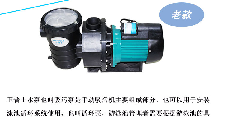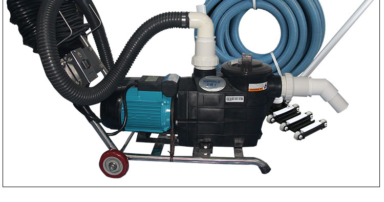 游泳池在使用沉淀劑后7~8小時,我們需要對游泳池進行吸污,并且只能用手動吸污機。本款吸污泵是游泳池吸污機的主要部件,泳池吸污機的配件還有吸污盤,吸污管浮球,不銹鋼小推車,帶電纜線及管路等。
