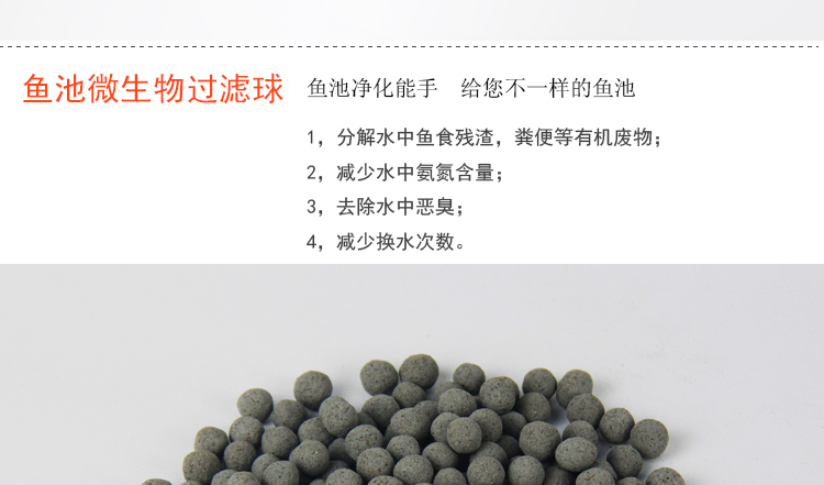 魚池微生物過濾球是魚池過濾的專用材料,是填充在魚池過濾砂缸中的過濾材料,用于魚池水質凈化處理。魚池砂缸中填充的過濾材料一共有四種,分別是微生物過濾球,活性炭,陶粒和石英砂。其中微生物過濾球的作用是分解魚池水中的魚糞,魚食殘渣中的有機廢物,使水質更加干凈清澈,而且可以減少水中氨氮含量,除去魚糞等產生的臭味。也可用于魚缸凈水除臭。
