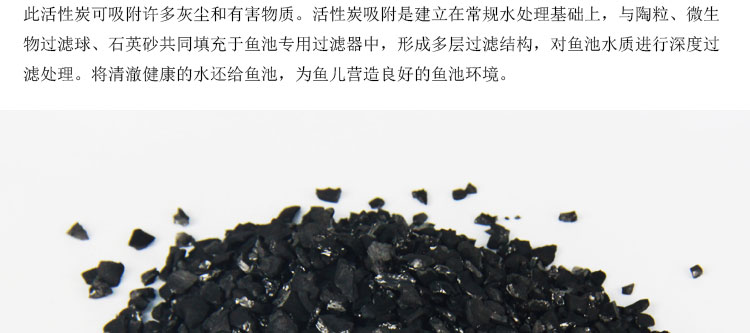 此活性炭是魚池專用過濾材料,可吸附許多灰塵和有害物質?;钚蕴课绞墙⒃诔R幩幚砘A上,與陶粒、微生物過濾球、石英砂共同填充于魚池專用過濾器中,形成多層過濾結構,對魚池水質進行深度過濾處理。將清澈健康的水還給魚池,為魚兒營造良好的魚池環境。