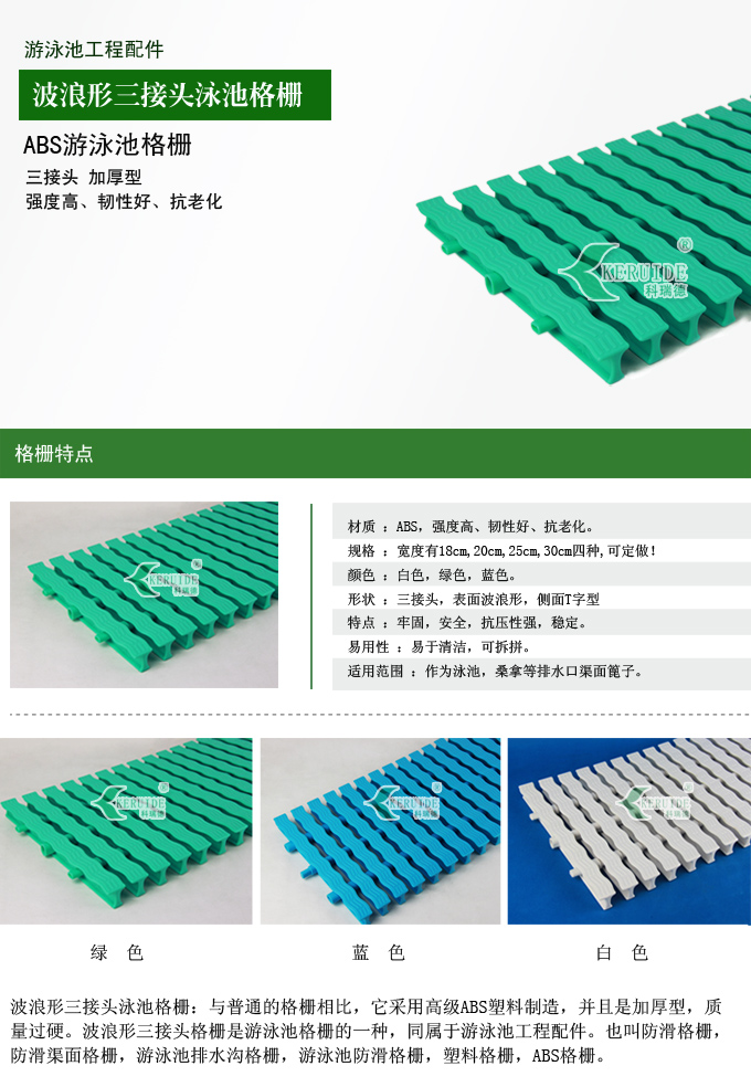 波浪形三接頭泳池格柵:與普通的游泳池格柵相比,它采用高級ABS塑料制造,并且是加厚型,質量過硬。波浪形三接頭格柵是游泳池格柵的一種,同屬于游泳池工程配件。也叫防滑格柵,防滑渠面格柵,游泳池排水溝格柵,游泳池防滑格柵,塑料格柵,ABS格柵。
